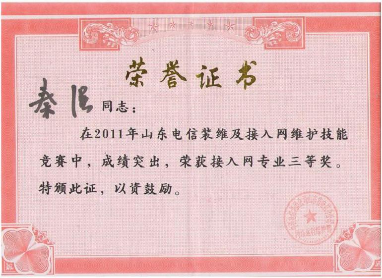 | 秦强获得2011年山东电信接入网专业技能比武第三名 |